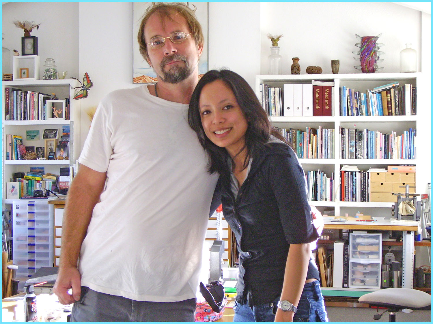 I recently took my Marriage of Metals class last quarter on a field trip to visit David Freda and Trish McAleer’s studio. I thought this would be a great way to expose the students to practicing metalsmiths who incorporate good design and phenomenal craftsmanship. This was such a great experience for everyone that I would like to incorporate more jewelry field trips in the future for my students! Both David and Trish were very gracious in letting me schedule an appointment with them for my students to come to their home and see their metal work and jewelry processes.