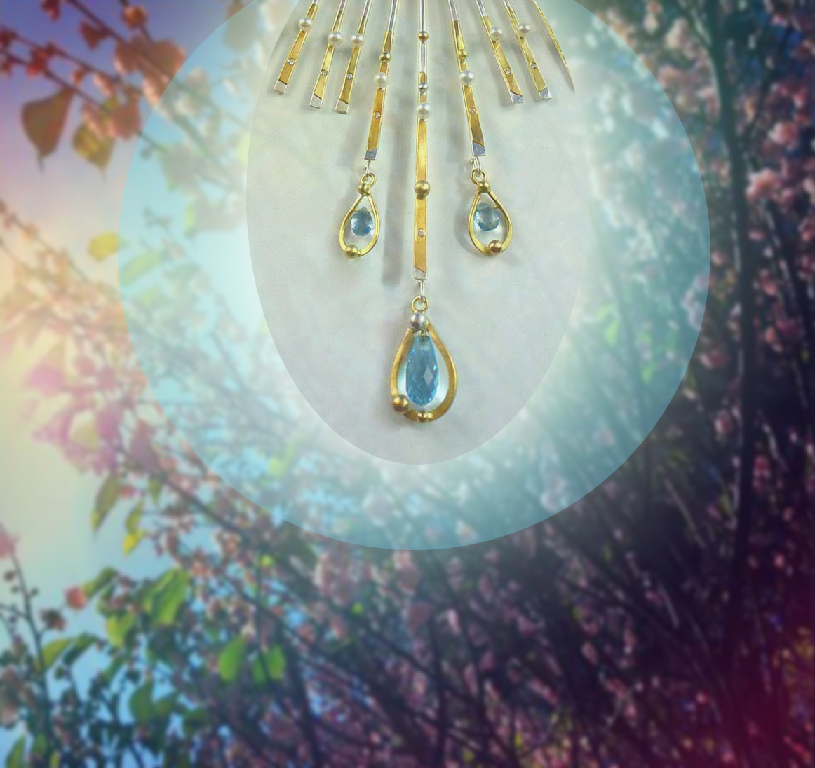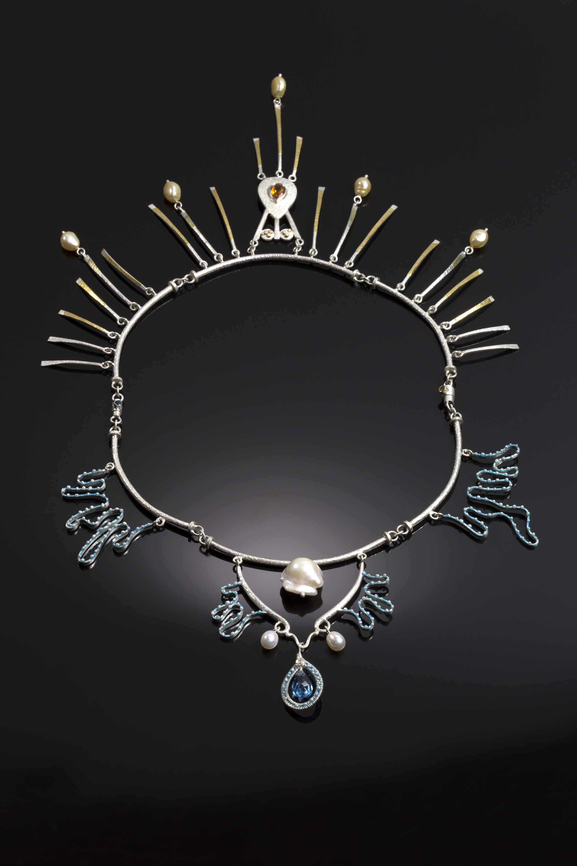 Sunrise Necklace: Made of sterling silver, 18kt gold, 24 kt gold and blue topaz briolettes. This Necklace Exhibited at the Japanese Friendship Garden& Museum in my group show, “Hajime”.