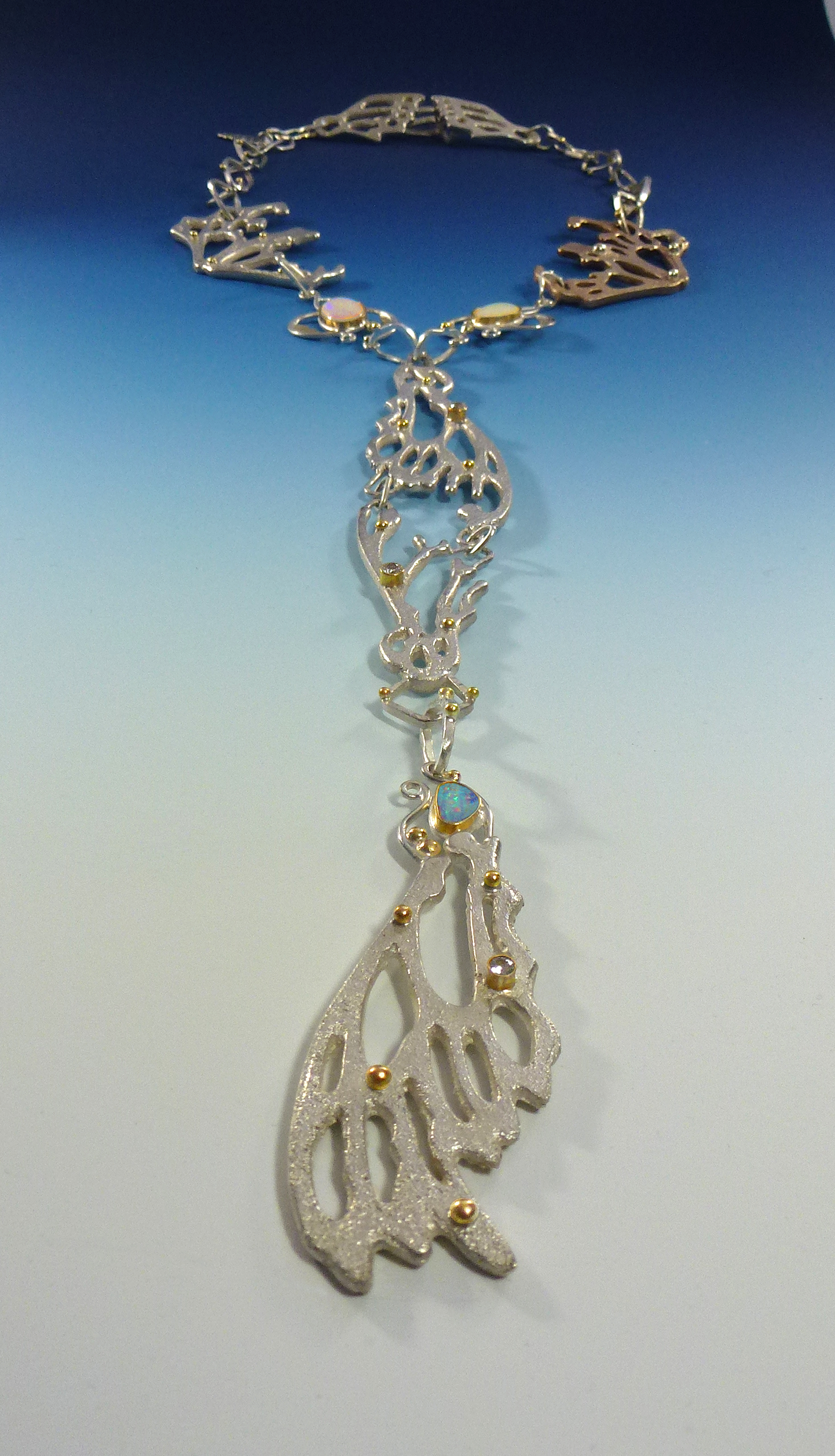Vanishing Butterfly Necklace: I sand cast the stylized wings in silver and bronze. I also fabricated additional gold details and set white sapphires and opals.
