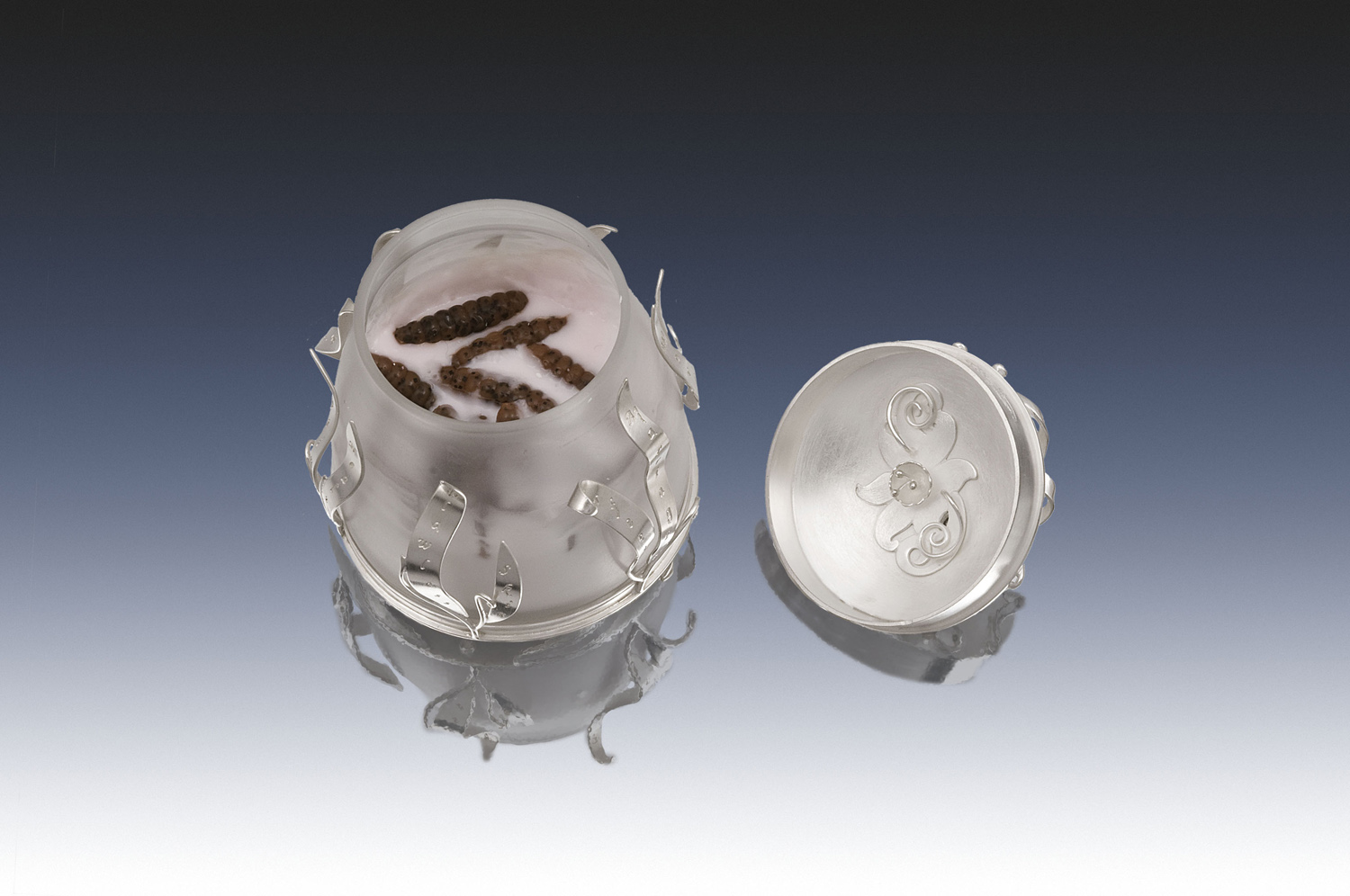 Creme de la Terre: This piece was a part of my MFA thesis exhibition, “Instruments of Vanity”. I fabricated this jar and spatula out of sterling silver, glass, lotion, and fishing tackle.