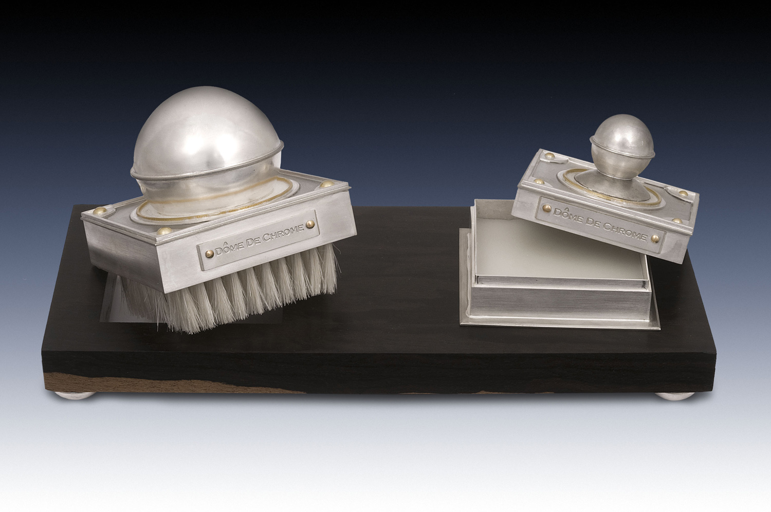 Dome de Chrome: I fabricated a polishing kit for a bald man out of sterling silver, nickel, gold and zircote wood. This piece was a part of my MFA thesis show, “Instruments of Vanity”.