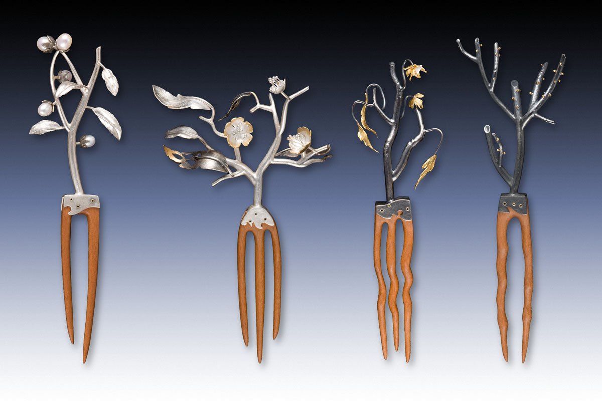 Cherry Blossom hair combs: I fabricated these hair combs out of sterling silver, gold, pearls and cherry wood. These pieces won first place in the Fashion Accessories Division of the Niche Competition