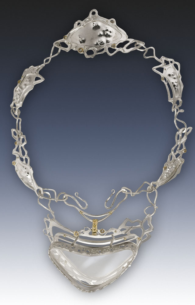 Savage Beauty: This is a head piece based on the kudzu plant. I fabricated this piece from antiqued sterling silver, 18kt gold, and prasiolite beads. This piece was featured in “Ornament Magazine” in 2009. I enhanced the piece in 2015 by adding gold details and giving it a dark patina. This piece was also featured in a group invitational exhibition in 2015 at The Metal Museum in Tennessee titled, “Inches from the Earth”.