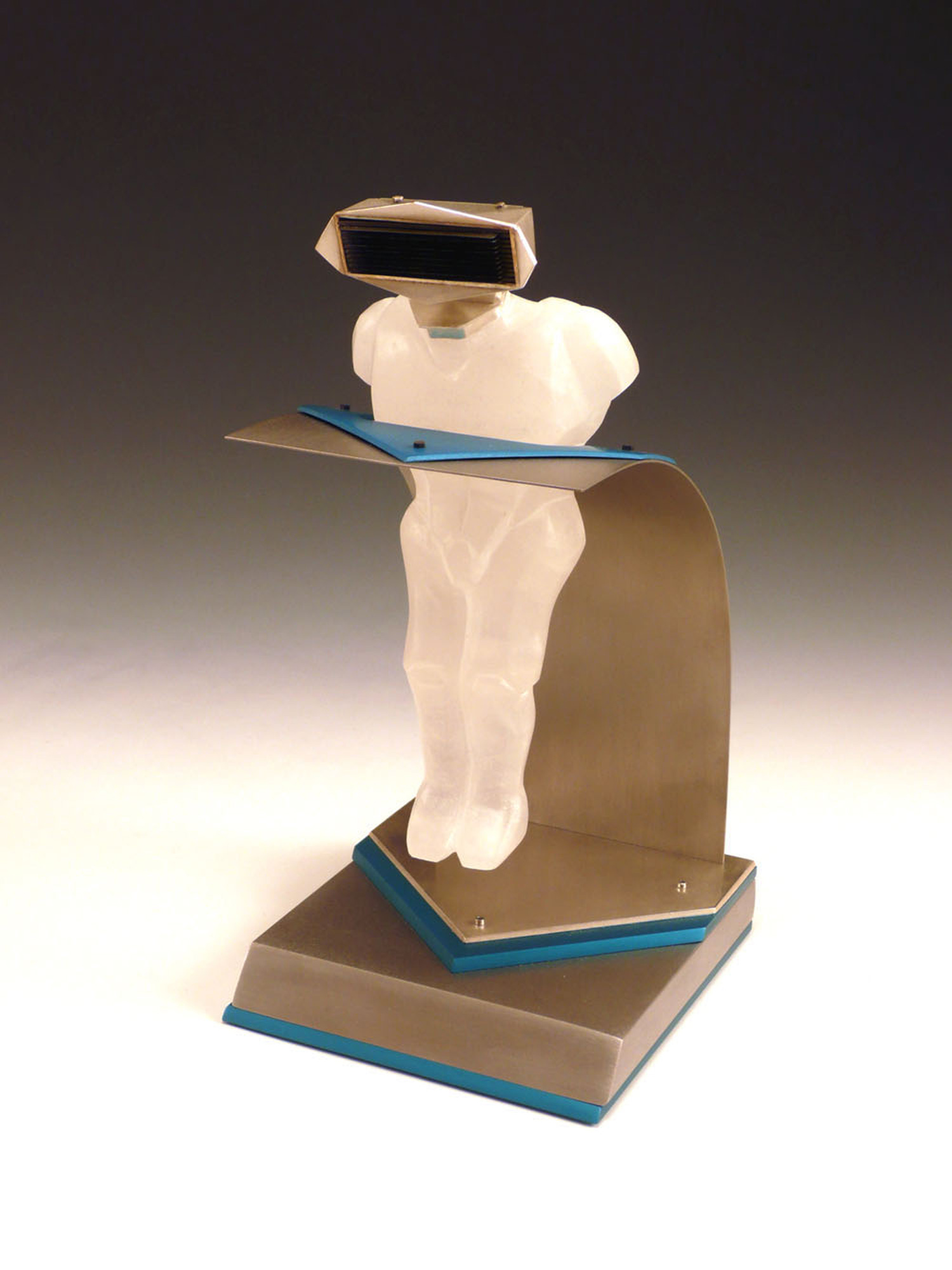 Stealth X: This is a men's razor I carved out of alabaster. I fabricated the base out of sterling silver, steel, aluminum, titanium, 10 razor blades, and nickel. This piece was a part of my MFA thesis show, Instruments of Vanity.