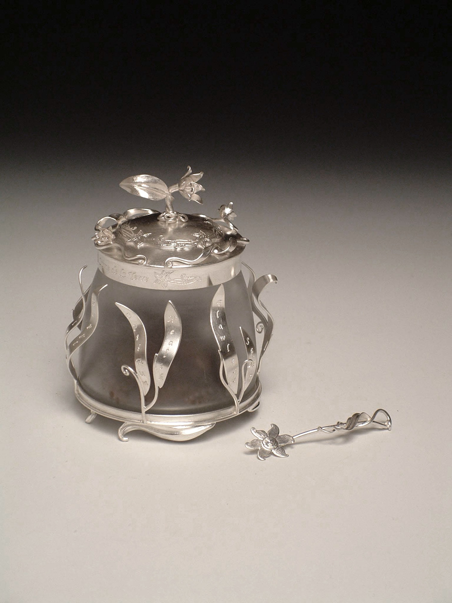 Sacred Earth Container: This box is fabricated out of sterling silver, 18kt gold, and cherry wood. Sand is stored within the box. Earth is a sacred element in Shinto practice and is used for spiritual cleansing. This container exhibited at The Metal Museum in Memphis, Tennessee.