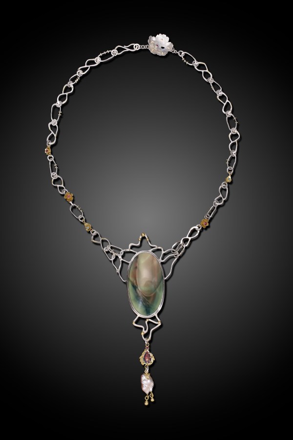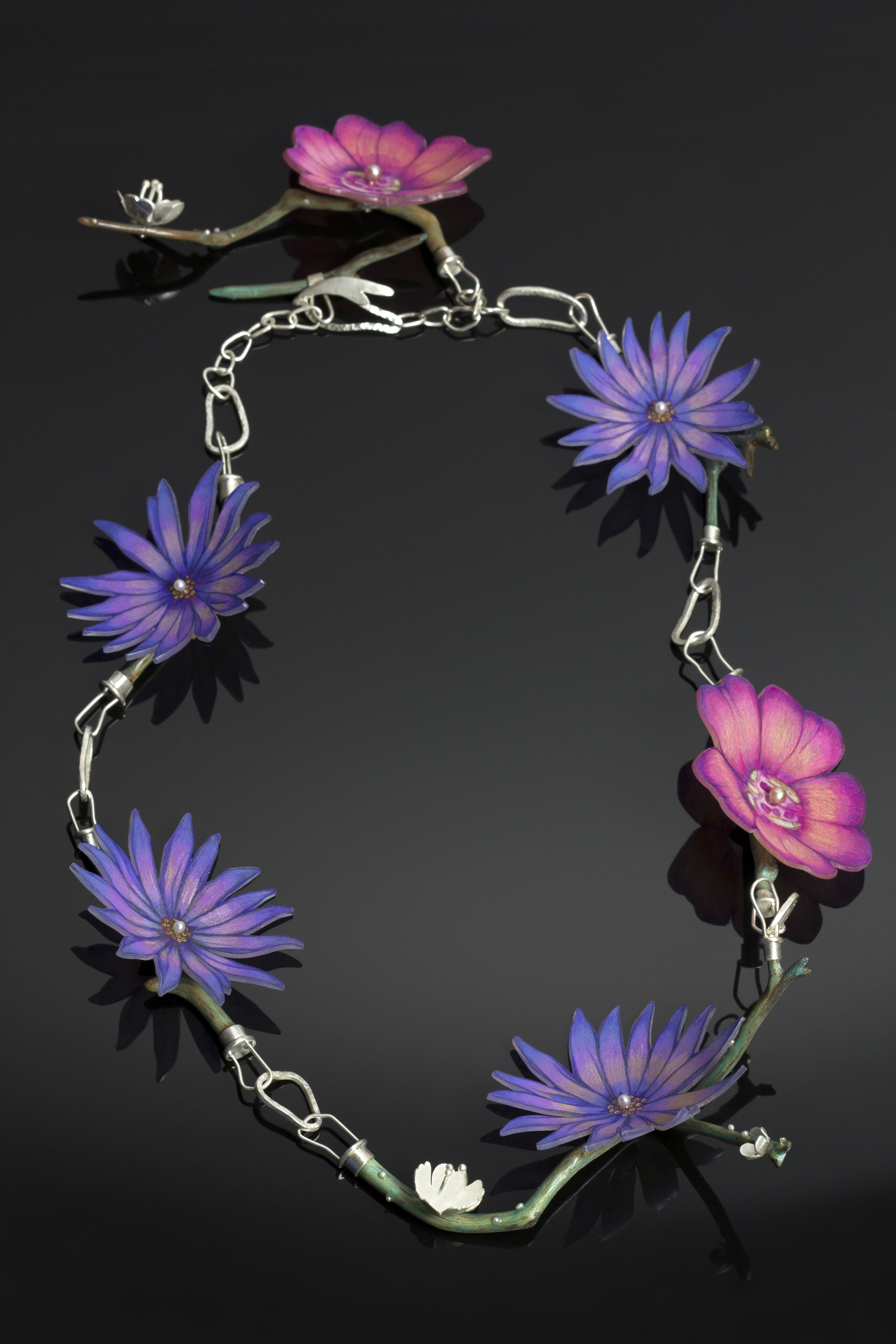This necklace titled, “Evanescent Beauty” is currently on exhibition at the Japanese Friendship Garden and Museum at the Inamori Pavilion. The Necklace is a part of a group Cherry Blossom exhibition. The necklace is made of sterling silver, 14kt gold, colored sapphires, opals and a flame pearl.