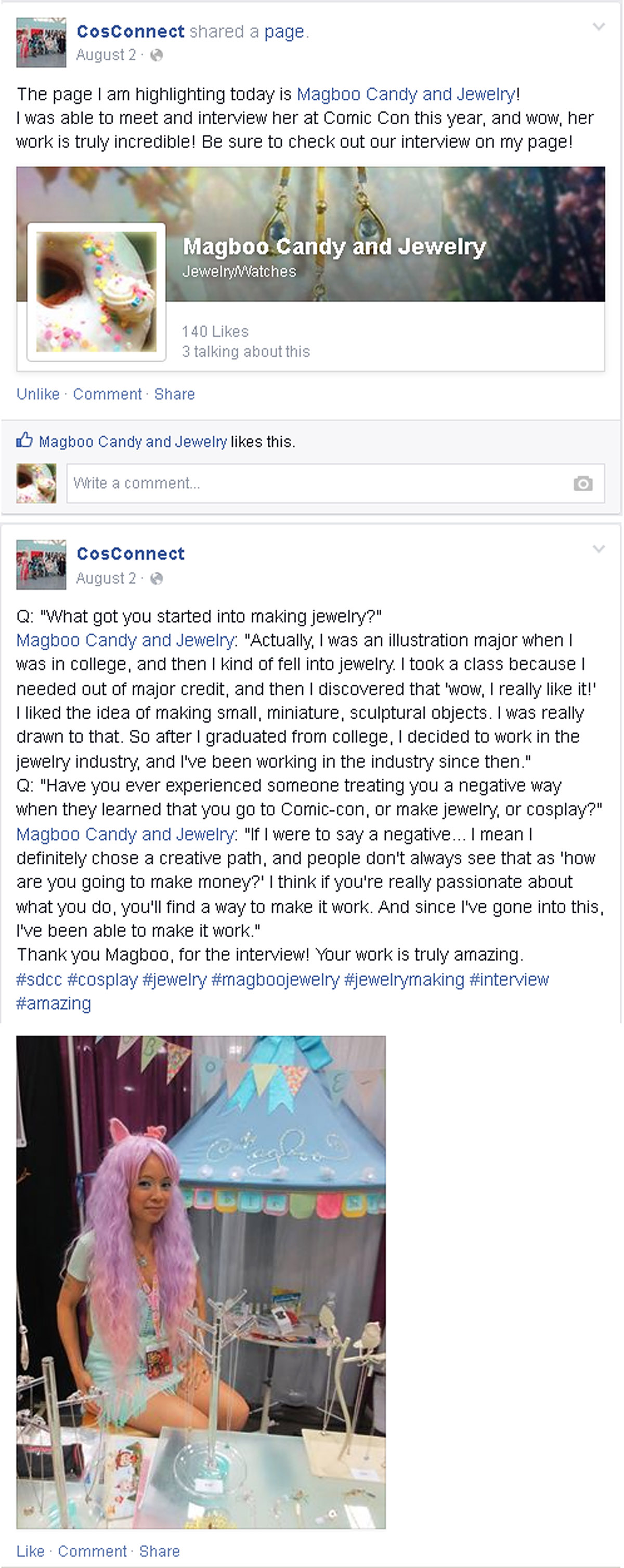 CosConnect is a Facebook page that highlights persons engaged in cosplay. I am not specifically involved in the cosplay community, however I was noticed for the costumes I wear and the jewelry I make when I exhibited at Comic-Con 2015. I one of the featured artists from Comic-Con 2015 on CosConnect’s Facebook page in August 2, 2015. My interview can be found at https://www.facebook.com/1599784706963008/photos/a.1613024582305687.1073741861.1599784706963008/1613024598972352/?type=1&theater