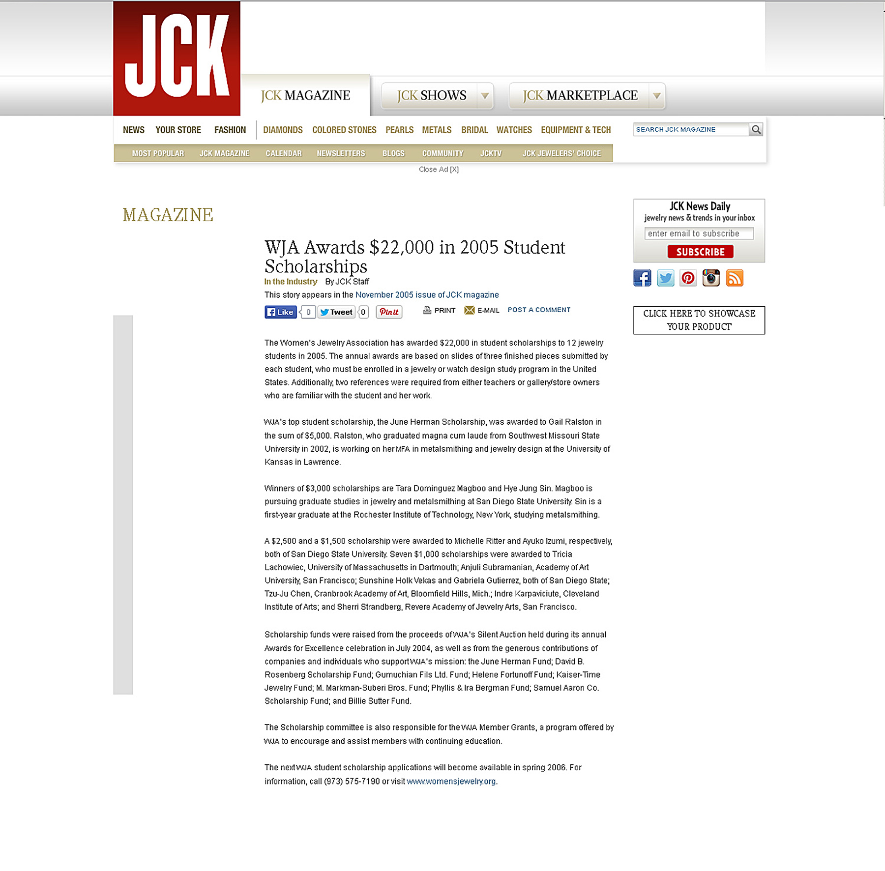 An online article on the JCK website featured the 2005 winners of the WJA national competition for educational scholarships. I was featured as one of the winners in the online article.