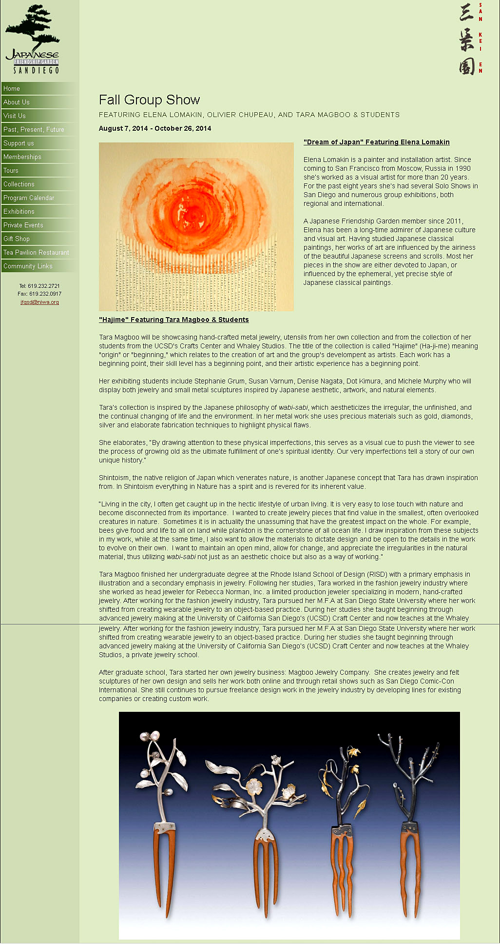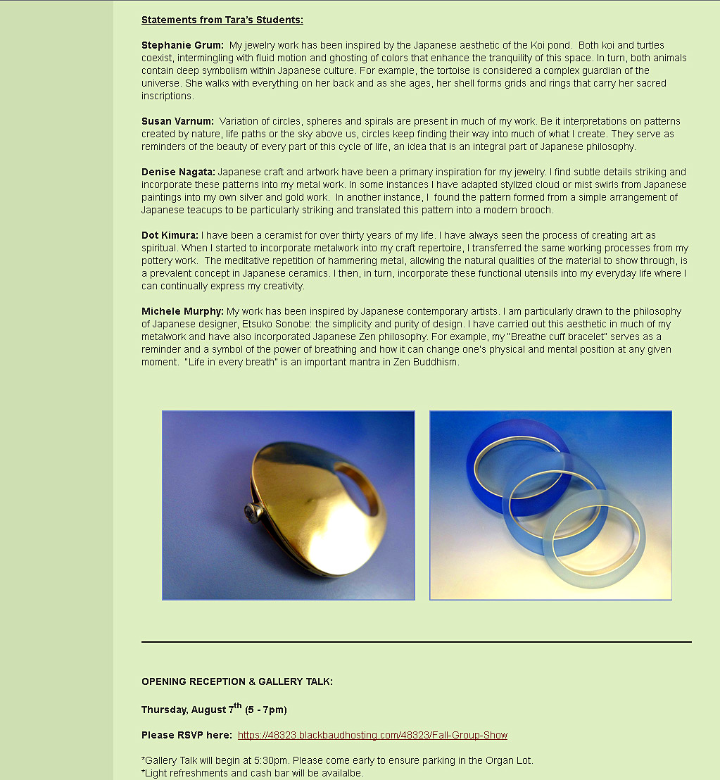 This is jewelry exhibition that I organized of my work and my students’ work from Whaley Studios and the former UCSD Crafts Center. The show is currently up in the Japanese Friendship Garden Museum from August 7 through October 26, 2014. The online article, featured on http://www.niwa.org (The Japanese Friendship Garden’s website) provides background information on my show, Hajime.