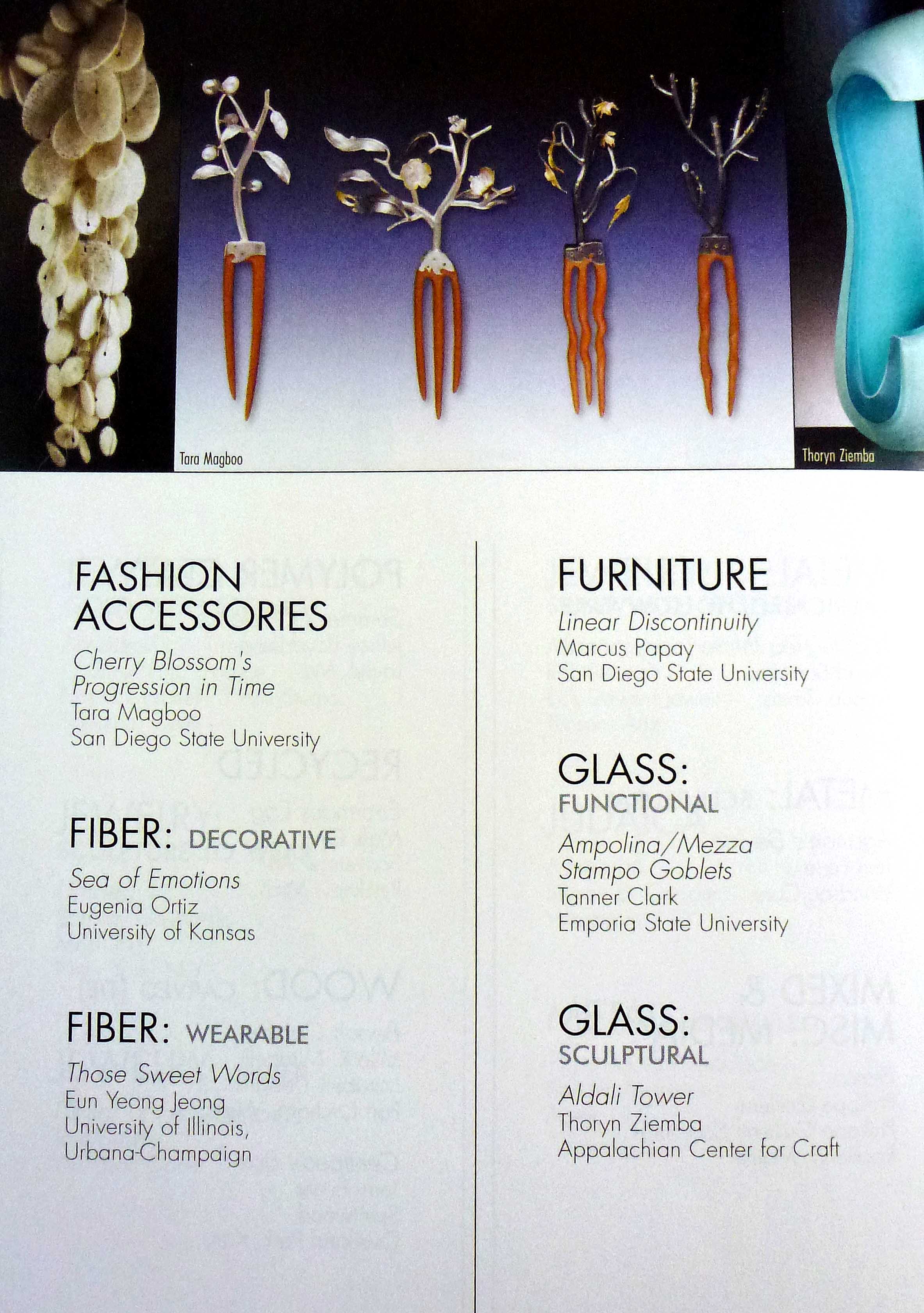 My “Cherry Blossoms Progression through Time” hair combs won the 2009 Fashion Accessories Student Division in the national Niche Award competition in 2009. I entered the competition while I was in graduate school at San Diego State University for Jewelry and Metalsmithing. My work was featured in the popular craft trade magazine, Niche.